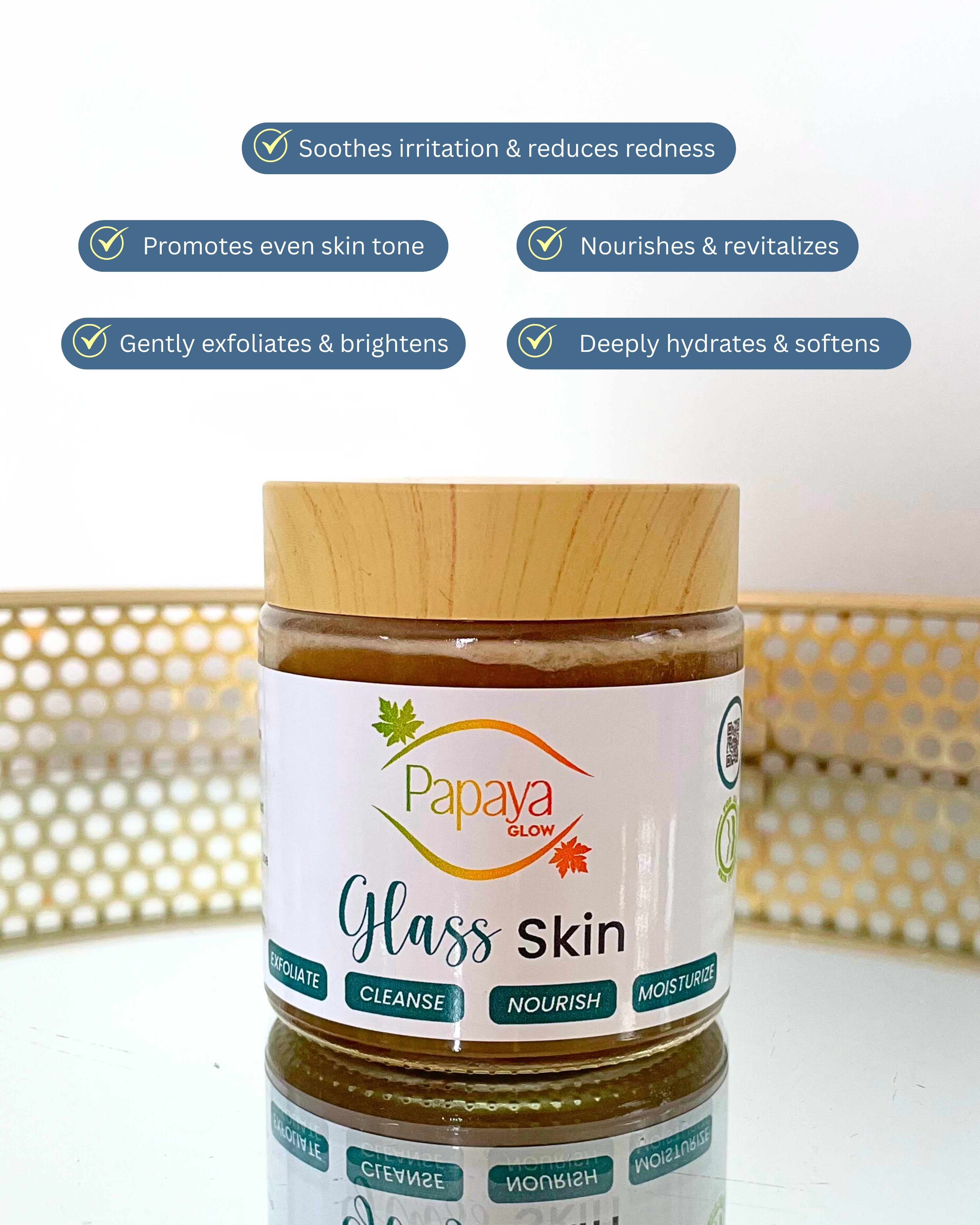 Our Glass Skin Glow consists of white and brown rice that gently exfoliate and brighten the skin, while mountain honey deeply hydrates and softens, leaving your complexion radiant and smooth. This blend soothes irritation, reduces redness, and promotes even skin tone. Together, they nourish and revitalize for a natural, healthy glow.